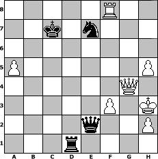 game notation in PGN-format [Event "HIGHLAND QUEEN II 2014"] [Site "www.myChess.de"] [Date "2014.02.11"] [Round "1"] [White "pepo47"] [Black "Grubengeist"] [ECO "D11"] [WhitemyELO "2079"] [BlackmyELO "1961"] [Result "1/2-1/2"] [TimeControl "10/2592000"] [WhiteDays "28"] [BlackDays "29"] [MyChessNo "92858"] 1. d4 d5 2. c4 c6 3. Nf3 dxc4 4. e3 Be6 5. Nc3 Nf6 6. Ng5 Bf5 7. Bxc4 e6 8. e4 Bg6 9. O-O b5 10. Bb3 b4 11. Ne2 h6 12. Nxe6 fxe6 13. Nf4 Bf7 14. Bxe6 Bxe6 15. Nxe6 Qd7 16. Nf4 g5 17. Ng6 Rg8 18. Nxf8 Rxf8 19. e5 Ng8 20. Bd2 a5 21. a3 Na6 22. axb4 Nc7 23. bxa5 Qxd4 24. Qh5+ Rf7 25. Bc3 Qh4 26. Qe2 Ne6 27. g3 Qh3 28. Rfd1 Ne7 29. Rd6 h5 30. Qc4 Qf5 31. Rf1 Nf4 32. f3 Nfd5 33. e6 Rh7 34. Bd2 Rh6 35. Rxc6 Rf6 36. Rc5 Rxe6 37. g4 Qe5 38. gxh5 Rd8 39. Re1 Qd6 40. Rxe6 Qxe6 41. b4 Qf6 42. Qe4 Rd6 43. b5 Re6 44. Qd3 Nf4 45. Bxf4 gxf4 46. Qc3 Qh4 47. Qd2 Qh3 48. Qf2 Rd6 49. Qe2 Qd7 50. Re5 Kd8 51. Qc4 Rd1+ 52. Kf2 Qh3 53. Qxf4 Qf1+ 54. Kg3 Qg1+ 55. Kh3 Qf1+ 56. Kh4 Qf2+ 57. Qg3 Qd4+ 58. Re4 Qf6+ 59. Kh3 Qf5+ 60. Qg4 Qxb5 61. Rb4 Qf1+ 62. Qg2 Qe1 63. Rb8+ Kc7 64. Rf8 Qe6+ 65. Qg4 Qe2 1/2-1/2 position notation in FEN-format 5R2/2k1n3/8/P6P/6Q1/5P1K/4q2P/3r4 - - - 10 66 Captured white pieces: Captured black pieces: Click on a captured piece in order to display the desired move!