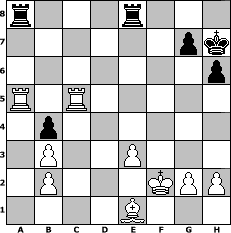 game notation in PGN-format [Event "Winter 19/20"] [Site "www.myChess.de"] [Date "2020.01.09"] [Round "2"] [White "HPB2005"] [Black "Rotstift10"] [ECO "A50"] [WhitemyELO "1901"] [BlackmyELO "1612"] [Result "1-0"] [TimeControl "10/2592000"] [WhiteDays "100"] [BlackDays "108"] [MyChessNo "116931"] 1. d4 Nf6 2. c4 d5 3. Nc3 c6 4. e3 Bf5 5. cxd5 cxd5 6. Qb3 Qb6 7. Nxd5 Nxd5 8. Qxd5 Bd7 9. Qb3 Qxb3 10. axb3 e6 11. Nf3 Bb4+ 12. Bd2 Bd6 13. Be2 O-O 14. Bc3 Nc6 15. O-O a6 16. Nd2 b5 17. Ne4 Be7 18. Rfd1 b4 19. Be1 a5 20. Rdc1 f5 21. Nc5 Bxc5 22. Rxc5 f4 23. Bc4 Nd8 24. d5 Kh8 25. Rc7 exd5 26. Bxd5 Bc6 27. Bxc6 Nxc6 28. Rxc6 fxe3 29. fxe3 h6 30. Rc5 Rfe8 31. Kf2 Kh7 32. Raxa5 1-0 position notation in FEN-format r3r3/6pk/7p/R1R5/1p6/1P2P3/1P3KPP/4B3 - - - 0 32 Captured white pieces: Captured black pieces: Click on a captured piece in order to display the desired move!