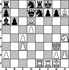 game notation in PGN-format [Event "November-Open 1/6"] [Site "www.myChess.de"] [Date "2007.11.05"] [Round "1"] [White "PeterLoskarn"] [Black "reisinger"] [ECO "C30"] [WhitemyELO "2046"] [BlackmyELO "1593"] [Result "1-0"] [TimeControl "10/1728000"] [WhiteDays "20"] [BlackDays "20"] [MyChessNo "39467"] 1. e4 e5 2. f4 Nc6 3. Nf3 exf4 4. d4 d5 5. exd5 Qxd5 6. Nc3 Bb4 7. Be2 Bxc3+ 8. bxc3 Nge7 9. c4 Qe4 10. O-O Nb4 11. c3 Nbc6 12. Bd3 Qe6 13. Bxf4 Qg4 14. Bxc7 O-O 15. d5 Nd8 16. Bd6 Re8 17. Qe1 Qd7 18. Qg3 b6 19. Rae1 Ba6 20. Bxh7+ Kf8 21. Nh4 1-0 position notation in FEN-format r2nrk2/p2qnppB/bp1B4/3P4/2P4N/2P3Q1/P5PP/4RRK1 - - - 2 21 Captured white pieces: ![]() ![]() ![]() ![]() ![]() ![]() ![]() ![]() ![]() ![]() ![]() ![]() ![]() ![]() ![]() Captured black pieces: ![]() ![]() ![]() ![]() ![]() ![]() ![]() ![]() ![]() ![]() ![]() ![]() ![]() ![]() ![]() Click on a captured piece in order to display the desired move!