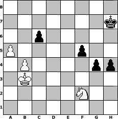 game notation in PGN-format [Event "Ohne techn. Hilfsmittel..."] [Site "www.myChess.de"] [Date "2013.02.13"] [Round "1"] [White "sprinterde"] [Black "Steffi"] [ECO "A35"] [WhitemyELO "1686"] [BlackmyELO "1537"] [Result "1-0"] [TimeControl "10/864000"] [WhiteDays "60"] [BlackDays "30"] [MyChessNo "86557"] 1. c4 c5 2. Nc3 Nc6 3. e3 Nf6 4. Nf3 e6 5. g3 d5 6. cxd5 exd5 7. Bb5 Bd7 8. d4 a6 9. Bxc6 bxc6 10. Ne5 Bd6 11. Nxd7 Qxd7 12. dxc5 Bxc5 13. O-O O-O 14. Qf3 Rfe8 15. Na4 Ba7 16. Rd1 Rad8 17. b4 Qh3 18. Bd2 d4 19. Be1 dxe3 20. Rxd8 exf2+ 21. Bxf2 Bxf2+ 22. Qxf2 Rxd8 23. Re1 h6 24. Nc5 Ng4 25. Qb2 Rd6 26. Nxa6 Rf6 27. Re8+ Kh7 28. Qb1+ g6 29. Re2 Rf2 30. Rxf2 Nxf2 31. Kxf2 Qxh2+ 32. Kf3 Qh5+ 33. Kf2 Qh2+ 34. Ke3 Qxg3+ 35. Kd4 Qf2+ 36. Kc3 Qf6+ 37. Kb3 Qf3+ 38. Ka4 Qd5 39. Nc5 Qd8 40. Qe4 Qd1+ 41. Ka3 Qc1+ 42. Kb3 Qd1+ 43. Qc2 Qd5+ 44. Ka3 f5 45. Qb3 Qxb3+ 46. Kxb3 h5 47. a4 h4 48. Nd3 g5 49. a5 g4 50. Nf2 1-0 position notation in FEN-format 8/7k/2p5/P4p2/1P4pp/1K6/5N2/8 - - - 1 50 Captured white pieces: Captured black pieces: Click on a captured piece in order to display the desired move!