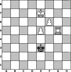 game notation in PGN-format [Event "Bei der Hitze gehe ich nicht raus"] [Site "www.myChess.de"] [Date "2022.07.22"] [Round "1"] [White "Achimkogge"] [Black "borsti"] [ECO "D00"] [WhitemyELO "1358"] [BlackmyELO "1347"] [Result "1-0"] [TimeControl "10/2592000"] [WhiteDays "191"] [BlackDays "210"] [MyChessNo "126571"] 1. d4 d5 2. c3 Bg4 3. h3 Bh5 4. g4 Bg6 5. Nd2 Nc6 6. b4 a6 7. Ngf3 h5 8. Nh4 Bh7 9. gxh5 e6 10. Nhf3 Nf6 11. Ng5 Bf5 12. Qa4 b5 13. Qb3 Nxh5 14. e3 Qxg5 15. Nf3 Qd8 16. Rg1 Nf6 17. a4 Bxh3 18. Bd3 g6 19. Ng5 Bf5 20. axb5 Nb8 21. Bxf5 exf5 22. bxa6 Rxa6 23. Rxa6 Nxa6 24. Qa4+ Nd7 25. Qxa6 Be7 26. Qc6 Bxg5 27. Qxd5 Bf6 28. Kd2 Nb6 29. Qc6+ Qd7 30. Qxf6 Rh2 31. Qe5+ Qe6 32. Qxh2 Nc4+ 33. Ke2 Nd6 34. Qh8+ Ke7 35. Qe5 Qxe5 36. dxe5 Ne4 37. Bb2 Ke6 38. c4 Kd7 39. Rd1+ Kc6 40. b5+ Kc5 41. Bd4+ Kxc4 42. Rb1 Nc3+ 43. Bxc3 Kxc3 44. Rc1+ Kb4 45. Rb1+ Kc5 46. f4 Kb6 47. Kd3 c6 48. Kc4 cxb5+ 49. Rxb5+ Kc6 50. Rb8 Kd7 51. Kd5 Ke7 52. Rb7+ Kf8 53. Kd6 Kg8 54. Ke7 Kg7 55. Rb6 Kg8 56. Rb8+ Kg7 57. Rf8 g5 58. Rxf7+ Kg6 59. Rf6+ Kh5 60. Rxf5 Kg4 61. Rxg5+ Kf3 62. f5 Kxe3 63. f6 1-0 position notation in FEN-format 8/4K3/5P2/4P1R1/8/4k3/8/8 - - - 0 63 Captured white pieces: Captured black pieces: Click on a captured piece in order to display the desired move!
