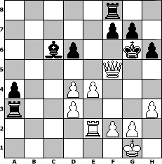 game notation in PGN-format [Event "Freibier f"] [Site "www.myChess.de"] [Date "2006.11.11"] [Round "1"] [White "Andylein1989"] [Black "crca108"] [ECO "C50"] [WhitemyELO "1442"] [BlackmyELO "1374"] [Result "1-0"] [TimeControl "10/864000"] [WhiteDays "31"] [BlackDays "29"] [MyChessNo "30030"] 1. e4 e5 2. Nf3 Nc6 3. Bc4 h6 4. O-O Nf6 5. Nc3 Bb4 6. a3 Bc5 7. d3 a6 8. Re1 b5 9. Bb3 Ng4 10. Re2 a5 11. h3 a4 12. Bd5 Nf6 13. Be3 Bxe3 14. Rxe3 Nxd5 15. Nxd5 d6 16. Nc3 Nd4 17. Re1 Qf6 18. Nxd4 exd4 19. Nxb5 O-O 20. Nxc7 Ra7 21. Nd5 Qg6 22. Qf3 Rb7 23. Re2 Rxb2 24. Ne7+ Kh7 25. Nxg6 Kxg6 26. Rc1 Ra2 27. c3 Rxa3 28. cxd4 Bd7 29. Rc6 Bxc6 30. Qf5# 1-0 position notation in FEN-format 5r2/5pp1/2bp2kp/5Q2/p2PP3/r2P3P/4RPP1/6K1 - - - 1 30 Captured white pieces: Captured black pieces: Click on a captured piece in order to display the desired move!