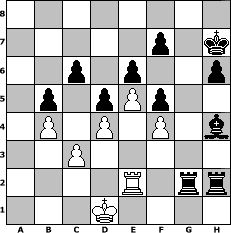game notation in PGN-format [Event "August 18"] [Site "www.myChess.de"] [Date "2018.08.01"] [Round "1"] [White "Master1"] [Black "borsti"] [ECO "D00"] [WhitemyELO "1213"] [BlackmyELO "1287"] [Result "0-1"] [TimeControl "10/1728000"] [WhiteDays "19"] [BlackDays "19"] [MyChessNo "112774"] 1. d4 d5 2. e3 Bf5 3. Bd3 Bxd3 4. Qxd3 e6 5. Qb5+ Nd7 6. Nf3 Qc8 7. O-O a6 8. Qd3 Ngf6 9. Nc3 Bd6 10. Re1 Nb6 11. e4 O-O 12. e5 Be7 13. Bg5 h6 14. Bxf6 gxf6 15. a3 f5 16. Ne2 Nc4 17. Rab1 Qd7 18. Ng3 Kh7 19. Nh5 Rg8 20. Nf6+ Bxf6 21. Nd2 Nxd2 22. Qxd2 Bg5 23. Qe2 b5 24. b4 c6 25. Rb3 Rg6 26. Rh3 a5 27. c3 Qd8 28. g3 axb4 29. f4 Be7 30. axb4 Ra3 31. Rc1 Qa8 32. Qe1 Ra2 33. Kf1 Qa3 34. Rd1 Qb2 35. Rd2 Qxd2 36. Qxd2 Rxd2 37. Ke1 Rc2 38. g4 Rxg4 39. Kd1 Ra2 40. Rg3 Rxh2 41. Re3 Bh4 42. Re2 Rgg2 0-1 position notation in FEN-format 8/5p1k/2p1p2p/1p1pPp2/1P1P1P1b/2P5/4R1rr/3K4 - - - 4 43 Captured white pieces: Captured black pieces: Click on a captured piece in order to display the desired move!