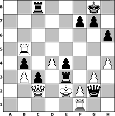 game notation in PGN-format [Event "Spass am Schach"] [Site "www.myChess.de"] [Date "2004.03.24"] [Round "1"] [White "Zoltan"] [Black "Phantasos"] [ECO "E12"] [WhitemyELO "1649"] [BlackmyELO "1796"] [Result "0-1"] [TimeControl "10/864000"] [WhiteDays "42"] [BlackDays "40"] [MyChessNo "3257"] 1. d4 Nf6 2. c4 e6 3. Nf3 b6 4. a3 d5 5. cxd5 exd5 6. g3 Bd6 7. Bg2 O-O 8. O-O Bb7 9. Nc3 Re8 10. Bg5 h6 11. Bxf6 Qxf6 12. Nb5 c6 13. Nxd6 Qxd6 14. Rc1 Nd7 15. Ne1 Ba6 16. Nd3 Re7 17. Re1 Rae8 18. e3 Bb5 19. Rc3 Nf6 20. Ne5 c5 21. Nf3 Ne4 22. Rc1 Rc7 23. Bf1 Bxf1 24. Kxf1 c4 25. Nd2 a6 26. Nxe4 dxe4 27. Rc3 b5 28. Qc2 Qe6 29. Rb1 Rec8 30. Rc1 a5 31. Qb1 b4 32. R3c2 Qd5 33. Ke1 Qh5 34. h4 Rc6 35. axb4 axb4 36. b3 c3 37. Ra2 Qf3 38. Qc2 Qh1+ 39. Ke2 Qg2 40. Ra5 Rf6 41. Rf1 Rf3 42. Rb5 Rxe3+ 0-1 position notation in FEN-format 2r3k1/5pp1/7p/1R6/1p1Pp2P/1Pp1r1P1/2Q1KPq1/5R2 - - - 0 43 Captured white pieces: Captured black pieces: Click on a captured piece in order to display the desired move!