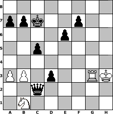 game notation in PGN-format [Event "Neues Jahr neue Er"] [Site "www.myChess.de"] [Date "2017.01.06"] [Round "1"] [White "Master1"] [Black "Achimkogge"] [ECO "A00"] [WhitemyELO "1311"] [BlackmyELO "1440"] [Result "0-1"] [TimeControl "10/2592000"] [WhiteDays "170"] [BlackDays "177"] [MyChessNo "106378"] 1. Nc3 d5 2. d4 c6 3. Nf3 Bf5 4. Bf4 Nd7 5. e3 Qa5 6. Bd3 Bg4 7. O-O Ngf6 8. h3 Bh5 9. Re1 h6 10. Be2 g5 11. Be5 Nxe5 12. dxe5 Nd7 13. Nd4 Bg6 14. Nb3 Qc7 15. Bd3 Bxd3 16. Qxd3 Nxe5 17. Qe2 O-O-O 18. Nd4 e6 19. a3 h5 20. Nf3 g4 21. Nxe5 Bg7 22. Nd3 Bf6 23. e4 d4 24. Nd1 gxh3 25. e5 Be7 26. gxh3 Rdg8+ 27. Kh1 c5 28. Rg1 Rxg1+ 29. Kxg1 Rg8+ 30. Kh1 Qc6+ 31. f3 Rg3 32. Ne1 Rxh3+ 33. Kg1 Bh4 34. Nf2 Bxf2+ 35. Qxf2 h4 36. Rd1 Rg3+ 37. Kh1 Qd5 38. b3 Qxe5 39. Nd3 Qg5 40. Rg1 Rh3+ 41. Qh2 Qf5 42. Rg2 Qxf3 43. Qxh3 Qxh3+ 44. Kg1 Qe3+ 45. Kh1 h3 46. Rg8+ Kc7 47. Rg7 Qf3+ 48. Kg1 Qd1+ 49. Kh2 Qxc2+ 50. Kxh3 Qxd3+ 51. Rg3 Qh7+ 52. Kg2 Qc2+ 53. Kh3 d3 0-1 position notation in FEN-format 8/ppk2p2/4p3/2p5/8/PP1p2RK/2q5/1N6 - - - 0 54 Captured white pieces: Captured black pieces: Click on a captured piece in order to display the desired move!