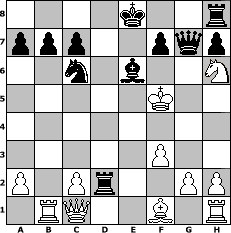 game notation in PGN-format [Event "Carpe Diem 2"] [Site "www.myChess.de"] [Date "2007.08.11"] [Round "1"] [White "kambo"] [Black "Phantasos"] [ECO "C00"] [WhitemyELO "1191"] [BlackmyELO "2153"] [Result "0-1"] [TimeControl "10/1728000"] [WhiteDays "20"] [BlackDays "51"] [MyChessNo "37227"] 1. e4 e6 2. Nf3 d5 3. Ne5 dxe4 4. d3 Nf6 5. Bg5 Qd5 6. Bxf6 gxf6 7. Ng4 Bg7 8. Nc3 Qc6 9. dxe4 f5 10. exf5 Bxc3+ 11. bxc3 Qxc3+ 12. Ke2 Nc6 13. f3 exf5 14. Nh6 Be6 15. Rb1 Rd8 16. Qc1 Bc4+ 17. Kf2 Rd2+ 18. Kg3 f4+ 19. Kxf4 Qe5+ 20. Kg4 Qg7+ 21. Kf5 Be6+ 0-1 position notation in FEN-format 4k2r/ppp2pqp/2n1b2N/5K2/8/5P2/P1Pr2PP/1RQ2B1R - k - 5 22 Captured white pieces: ![]() ![]() ![]() ![]() ![]() ![]() ![]() ![]() ![]() ![]() ![]() ![]() ![]() ![]() ![]() Captured black pieces: ![]() ![]() ![]() ![]() ![]() ![]() ![]() ![]() ![]() ![]() ![]() ![]() ![]() ![]() ![]() Click on a captured piece in order to display the desired move!