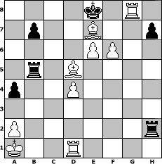 game notation in PGN-format [Event "Hei"] [Site "www.myChess.de"] [Date "2007.10.19"] [Round "2"] [White "Rufus"] [Black "lure"] [ECO "C34"] [WhitemyELO "1577"] [BlackmyELO "1525"] [Result "1-0"] [TimeControl "10/2592000"] [WhiteDays "112"] [BlackDays "098"] [MyChessNo "39043"] 1. e4 e5 2. f4 exf4 3. Nf3 Nc6 4. d4 d6 5. Bxf4 Bg4 6. Nc3 Nf6 7. Qd3 Bxf3 8. gxf3 Be7 9. O-O-O O-O 10. Qb5 Qb8 11. Rg1 a6 12. Qf5 Qc8 13. Bh6 Qxf5 14. exf5 Nh5 15. Nd5 f6 16. Nxc7 Rac8 17. Ne6 Rf7 18. Bd2 Nd8 19. f4 d5 20. Be2 Rc6 21. Bxh5 Nxe6 22. fxe6 Rf8 23. f5 Rfc8 24. Bf3 Rxc2+ 25. Kb1 a5 26. Bxd5 a4 27. Bh6 Rxh2 28. Bxg7 Rcc2 29. Bxf6+ Kf8 30. Bxe7+ Ke8 31. f6 Rxb2+ 32. Ka1 Rb5 33. Rg8# 1-0 position notation in FEN-format 4k1R1/1p2B2p/4PP2/1r1B4/p2P4/8/P6r/K2R4 - - - 3 33 Captured white pieces: Captured black pieces: Click on a captured piece in order to display the desired move!