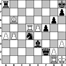 game notation in PGN-format [Event "f"] [Site "www.myChess.de"] [Date "2005.12.25"] [Round "1"] [White "Caligula"] [Black "crca108"] [ECO "A40"] [WhitemyELO "1273"] [BlackmyELO "1426"] [Result "0-1"] [TimeControl "10/864000"] [WhiteDays "10"] [BlackDays "10"] [MyChessNo "21171"] 1. d4 g6 2. Nf3 Bg7 3. c4 Nf6 4. Nc3 d5 5. h3 dxc4 6. Qa4+ Bd7 7. Qxc4 O-O 8. e4 a6 9. e5 Bb5 10. Nxb5 axb5 11. Qxb5 Nd5 12. Qxb7 Ra5 13. Bd2 Ra4 14. Bb5 Nb6 15. Bxa4 Nxa4 16. Qb3 Qd7 17. O-O Na6 18. Rab1 Rb8 19. Qc2 f6 20. Rfe1 f5 21. b3 Nb6 22. Ba5 Nd5 23. Qc4 Ra8 24. a4 e6 25. Rec1 Bh6 26. Qc6 Qd8 27. Qxe6+ Kh8 28. Rc6 Nb8 29. Rc5 Nf4 30. Qc6 Nxc6 31. b4 Ne2+ 32. Kf1 Nexd4 33. Rd1 Qd7 34. Nxd4 Nxd4 35. Rxc7 Qd5 36. Rc5 Qe4 37. Re1 Qd3+ 38. Kg1 Ne2+ 39. Kh1 Bd2 40. Rd1 Nd4 41. Rd5 Qe2 42. Rg1 Qxf2 43. Bb6 Be3 0-1 position notation in FEN-format r6k/7p/1B4p1/3RPp2/PP1n4/4b2P/5qP1/6RK - - - 2 44 Captured white pieces: Captured black pieces: Click on a captured piece in order to display the desired move!