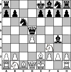 game notation in PGN-format [Event "In Memorium Michael Knopf 3"] [Site "www.myChess.de"] [Date "2014.05.01"] [Round "1"] [White "pepo47"] [Black "kalle"] [ECO "B22"] [WhitemyELO "2071"] [BlackmyELO "1564"] [Result "1-0"] [TimeControl "10/2592000"] [WhiteDays "24"] [BlackDays "00"] [MyChessNo "94238"] 1. e4 c5 2. c3 d5 3. exd5 Qxd5 4. d4 Nc6 5. Nf3 cxd4 6. cxd4 Bg4 7. Be2 1-0 position notation in FEN-format r3kbnr/pp2pppp/2n5/3q4/3P2b1/5N2/PP2BPPP/RNBQK2R - KQkq - 2 7 Captured white pieces: Captured black pieces: Click on a captured piece in order to display the desired move!