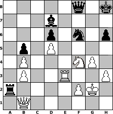 game notation in PGN-format [Event "November-Open 1/6"] [Site "www.myChess.de"] [Date "2007.11.05"] [Round "1"] [White "PeterLoskarn"] [Black "HenrySchinasky"] [ECO "B03"] [WhitemyELO "2046"] [BlackmyELO "1935"] [Result "1-0"] [TimeControl "10/1728000"] [WhiteDays "20"] [BlackDays "19"] [MyChessNo "39434"] 1. e4 Nf6 2. e5 Nd5 3. d4 d6 4. c4 Nb6 5. exd6 cxd6 6. Nc3 g6 7. Be3 Bg7 8. Rc1 Nc6 9. d5 Nb4 10. a3 Na6 11. Be2 O-O 12. h3 e6 13. Nf3 exd5 14. cxd5 Nc7 15. O-O Re8 16. Re1 Bxc3 17. Bxb6 axb6 18. Rxc3 Bf5 19. Bc4 Rxe1+ 20. Qxe1 b5 21. Bb3 b4 22. axb4 Ne8 23. g4 Bd7 24. Kg2 h6 25. Qe3 Kg7 26. Qd4+ Kh7 27. Rc1 Nf6 28. Re1 Ra6 29. Bc4 b5 30. Bd3 Kg8 31. Kg3 Kh7 32. Nh4 Rb6 33. Re3 Ra6 34. b3 Kg7 35. Bb1 Kh7 36. Rf3 Kg7 37. Ng2 Ra8 38. Nf4 Ra3 39. Kg2 Qe7 40. Re3 Qd8 41. Bc2 Ra2 42. Bxg6 fxg6 43. Qd3 Qf8 44. Qxg6+ Kh8 45. Qb1 1-0 position notation in FEN-format 5q1k/3b4/3p1n1p/1p1P4/1P3NP1/1P2R2P/r4PK1/1Q6 - - - 2 45 Captured white pieces: ![]() ![]() ![]() ![]() ![]() ![]() ![]() ![]() ![]() ![]() ![]() ![]() ![]() ![]() ![]() Captured black pieces: ![]() ![]() ![]() ![]() ![]() ![]() ![]() ![]() ![]() ![]() ![]() ![]() ![]() ![]() ![]() Click on a captured piece in order to display the desired move!