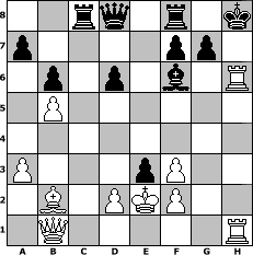 game notation in PGN-format [Event "Wikingermeisterschaft Endrunde"] [Site "www.myChess.de"] [Date "2006.08.05"] [Round "2"] [White "nogumo"] [Black "73DADDELDU37"] [ECO "A00"] [WhitemyELO "1794"] [BlackmyELO "1551"] [Result "1-0"] [TimeControl "10/1728000"] [WhiteDays "57"] [BlackDays "60"] [MyChessNo "27437"] 1. b4 e6 2. Bb2 Nf6 3. b5 Be7 4. e3 c6 5. Nf3 O-O 6. c4 cxb5 7. cxb5 d6 8. Be2 b6 9. Qc2 Bb7 10. Ng5 h6 11. h4 Nbd7 12. Bf3 Rc8 13. Nc3 Bxf3 14. Nxf3 Nd5 15. a3 Bf6 16. Rc1 Ne5 17. Qb1 Nxf3+ 18. gxf3 Bxh4 19. Ke2 Bf6 20. Rcg1 Kh8 21. Nxd5 exd5 22. Rh5 d4 23. Rgh1 dxe3 24. Rxh6+ 1-0 position notation in FEN-format 2rq1r1k/p4pp1/1p1p1b1R/1P6/8/P3pP2/1B1PKP2/1Q5R - - - 0 24 Captured white pieces: Captured black pieces: Click on a captured piece in order to display the desired move!