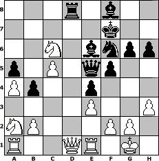 game notation in PGN-format [Event "Windecker Herbst-Open"] [Site "www.myChess.de"] [Date "2014.10.08"] [Round "1"] [White "martinus"] [Black "espero"] [ECO "A80"] [WhitemyELO "1726"] [BlackmyELO "1764"] [Result "1-0"] [TimeControl "10/1728000"] [WhiteDays "20"] [BlackDays "19"] [MyChessNo "96183"] 1. d4 f5 2. Nf3 Nf6 3. c4 g6 4. Nc3 Bg7 5. Bf4 O-O 6. e3 d6 7. Bd3 c6 8. O-O Nh5 9. Re1 Qe8 10. Bg5 e5 11. dxe5 dxe5 12. Nd2 e4 13. Be2 Nf6 14. Nb3 h6 15. Bf4 Nbd7 16. Bd6 Rf7 17. c5 b5 18. a4 b4 19. Na2 a5 20. Bc4 Ne5 21. Bxe5 Qxe5 22. Qd8+ Bf8 23. Bxf7+ Kxf7 24. Qd4 Qc7 25. h3 Be6 26. Qd1 Rd8 27. Nd4 Qe5 28. Nxc6 1-0 position notation in FEN-format 3r1b2/5k2/2N1bnpp/p1P1qp2/Pp2p3/4P2P/NP3PP1/R2QR1K1 - - - 0 28 Captured white pieces: Captured black pieces: Click on a captured piece in order to display the desired move!