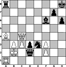 game notation in PGN-format [Event "Bald kommt der Winter"] [Site "www.myChess.de"] [Date "2013.10.31"] [Round "2"] [White "reisender"] [Black "Caligula"] [ECO "D01"] [WhitemyELO "1431"] [BlackmyELO "1335"] [Result "0-1"] [TimeControl "10/2592000"] [WhiteDays "147"] [BlackDays "144"] [MyChessNo "90884"] 1. d4 d5 2. Nc3 Nf6 3. Bg5 e6 4. Qd3 Be7 5. O-O-O Nc6 6. h4 h6 7. Bf4 a6 8. Be5 Nb4 9. Qg3 O-O 10. Qe3 Ng4 11. Qg3 Nxe5 12. dxe5 f6 13. Kb1 fxe5 14. Qxe5 Bf6 15. Qe3 d4 16. Qe4 c5 17. Na4 Rb8 18. Nxc5 e5 19. e3 b6 20. Nf3 bxc5 21. exd4 cxd4 22. Bc4+ Kh8 23. a3 Bb7 24. Qe2 Bxf3 25. gxf3 Nc6 26. Bxa6 Qb6 27. b3 Ra8 28. Bb5 Rxa3 29. Kb2 Rfa8 30. Ra1 Qa5 31. Ba4 Rxa1 32. Rxa1 Qc3+ 33. Kb1 Bxh4 34. Qb5 Nb4 35. Qe2 Nd5 36. Qxe5 Nb4 37. Qe2 Bf6 38. Qc4 Qe1+ 39. Kb2 d3+ 40. c3 Qd2+ 41. Ka3 Nc2+ 42. Kb2 Ne3+ 0-1 position notation in FEN-format r6k/6p1/5b1p/8/B1Q5/1PPpnP2/1K1q1P2/R7 - - - 5 43 Captured white pieces: Captured black pieces: Click on a captured piece in order to display the desired move!