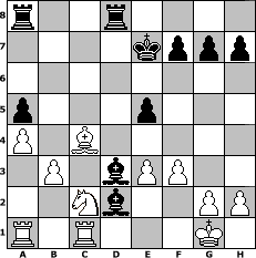 game notation in PGN-format [Event "K"] [Site "www.myChess.de"] [Date "2004.04.28"] [Round "1"] [White "MaxPayne"] [Black "doctordot2004"] [ECO "D24"] [WhitemyELO "1426"] [BlackmyELO "1487"] [Result "0-1"] [TimeControl "10/3456000"] [WhiteDays "118"] [BlackDays "120"] [MyChessNo "4215"] 1. d4 d5 2. c4 dxc4 3. Nf3 Nf6 4. Nc3 a6 5. e3 b5 6. a4 b4 7. Nb1 Bb7 8. Bxc4 c5 9. Ne5 e6 10. O-O Nc6 11. Nxc6 Bxc6 12. dxc5 Qxd1 13. Rxd1 Bxc5 14. Nd2 Ke7 15. b3 Nd5 16. Bb2 Nc3 17. Rdc1 Rhd8 18. Nf3 Be4 19. Bxc3 bxc3 20. Rxc3 Bb4 21. Rcc1 a5 22. Nd4 e5 23. Nc2 Bd2 24. f3 Bd3 0-1 position notation in FEN-format r2r4/4kppp/8/p3p3/P1B5/1P1bPP2/2Nb2PP/R1R3K1 - - - 1 25 Captured white pieces: ![]() ![]() ![]() ![]() ![]() ![]() ![]() ![]() ![]() ![]() ![]() ![]() ![]() ![]() ![]() Captured black pieces: ![]() ![]() ![]() ![]() ![]() ![]() ![]() ![]() ![]() ![]() ![]() ![]() ![]() ![]() ![]() Click on a captured piece in order to display the desired move!