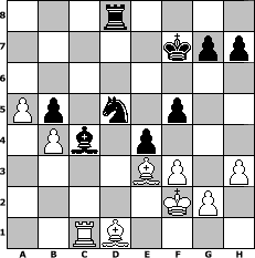 game notation in PGN-format [Event "Sweschnikow II"] [Site "www.myChess.de"] [Date "2012.04.28"] [Round "1"] [White "Naunhofer"] [Black "Sanji"] [ECO "B33"] [WhitemyELO "1640"] [BlackmyELO "1627"] [Result "1/2-1/2"] [TimeControl "10/1728000"] [WhiteDays "20"] [BlackDays "20"] [MyChessNo "81293"] 1. e4 c5 2. Nf3 Nc6 3. d4 cxd4 4. Nxd4 Nf6 5. Nc3 e5 6. Nxc6 bxc6 7. Bd3 Bb4 8. Bd2 O-O 9. O-O d6 10. a3 Ba5 11. b4 Bb6 12. Na4 Be6 13. Nxb6 axb6 14. c4 d5 15. cxd5 cxd5 16. exd5 Qxd5 17. Be3 Rab8 18. Qe2 Rfd8 19. Rfd1 e4 20. Bc2 Qc6 21. Rac1 Rxd1+ 22. Qxd1 Qd5 23. a4 Ng4 24. Qxd5 Bxd5 25. Bd4 f5 26. h3 Nf6 27. Bd1 b5 28. a5 Bc4 29. f3 Kf7 30. Kf2 Rd8 31. Be3 Nd5 1/2-1/2 position notation in FEN-format 3r4/5kpp/8/Pp1n1p2/1Pb1p3/4BP1P/5KP1/2RB4 - - - 5 32 Captured white pieces: Captured black pieces: Click on a captured piece in order to display the desired move!