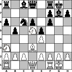 game notation in PGN-format [Event "Godzilla Open - Gruppe B"] [Site "www.myChess.de"] [Date "2014.04.01"] [Round "1"] [White "hubi"] [Black "nyffhans"] [ECO "B32"] [WhitemyELO "1829"] [BlackmyELO "2037"] [Result "1-0"] [TimeControl "10/2592000"] [WhiteDays "30"] [BlackDays "12"] [MyChessNo "93806"] 1. e4 c5 2. Nf3 Nc6 3. d4 cxd4 4. Nxd4 e6 5. Nc3 Nf6 6. Ndb5 d6 7. Bf4 e5 8. Bg5 a6 9. Na3 b5 10. Bxf6 gxf6 11. Nd5 Bg7 12. Bd3 O-O 13. O-O 1-0 position notation in FEN-format r1bq1rk1/5pbp/p1np1p2/1p1Np3/4P3/N2B4/PPP1PPPP/R2Q1RK1 - - - 5 13 Captured white pieces: Captured black pieces: Click on a captured piece in order to display the desired move!