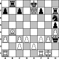 game notation in PGN-format [Event "Schachmatt unter Palmen"] [Site "www.myChess.de"] [Date "2009.07.13"] [Round "1"] [White "rgHD"] [Black "Steppenwolf"] [ECO "A20"] [WhitemyELO "1528"] [BlackmyELO "1198"] [Result "1-0"] [TimeControl "10/864000"] [WhiteDays "10"] [BlackDays "09"] [MyChessNo "57419"] 1. c4 e5 2. g3 d5 3. cxd5 Qxd5 4. Nf3 Nc6 5. Nc3 Qd8 6. Bg2 Bg4 7. Qa4 Nf6 8. Nxe5 Bd6 9. Nxg4 Nxg4 10. Bxc6+ bxc6 11. Qxc6+ Kf8 12. d3 Bb4 13. O-O h5 14. h4 g5 15. Bxg5 Qc8 16. a3 Bxc3 17. bxc3 Rb8 18. Qc5+ Kg8 19. f3 Nh6 20. Bf6 Rh7 21. Qg5+ Kf8 22. Be7+ Ke8 23. Bb4 Qh3 24. Qe7# 1-0 position notation in FEN-format 1r2k3/p1p1Qp1r/7n/7p/1B5P/P1PP1PPq/2P1P3/R4RK1 - - - 10 24 Captured white pieces: ![]() ![]() ![]() ![]() ![]() ![]() ![]() ![]() ![]() ![]() ![]() ![]() ![]() ![]() ![]() Captured black pieces: ![]() ![]() ![]() ![]() ![]() ![]() ![]() ![]() ![]() ![]() ![]() ![]() ![]() ![]() ![]() Click on a captured piece in order to display the desired move!