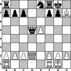 game notation in PGN-format [Event "Jahreswechsel 2016/17"] [Site "www.myChess.de"] [Date "2016.12.03"] [Round "1"] [White "spiderman"] [Black "shan"] [ECO "A15"] [WhitemyELO "1827"] [BlackmyELO "1461"] [Result "1-0"] [TimeControl "10/3456000"] [WhiteDays "36"] [BlackDays "39"] [MyChessNo "105932"] 1. c4 Nf6 2. Nf3 d6 3. d4 e6 4. e3 d5 5. Nc3 Nc6 6. Bd3 Bb4 7. O-O O-O 8. Bd2 Bd7 9. Ne5 Nxe5 10. dxe5 Ne8 11. cxd5 exd5 12. Nxd5 Bxd2 13. Qxd2 Bc6 14. e4 Bxd5 15. exd5 Qxd5 16. Bxh7+ 1-0 position notation in FEN-format r3nrk1/ppp2ppB/8/3qP3/8/8/PPPQ1PPP/R4RK1 - - - 0 16 Captured white pieces: ![]() ![]() ![]() ![]() ![]() ![]() ![]() ![]() ![]() ![]() ![]() ![]() ![]() ![]() ![]() Captured black pieces: ![]() ![]() ![]() ![]() ![]() ![]() ![]() ![]() ![]() ![]() ![]() ![]() ![]() ![]() ![]() Click on a captured piece in order to display the desired move!