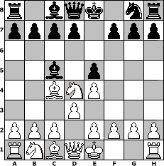 game notation in PGN-format [Event "Auf Die WM!!!!!!!!!!!! (2010 werden wir Meister)"] [Site "www.myChess.de"] [Date "2006.07.21"] [Round "2"] [White "Andylein1989"] [Black "Martin2008"] [ECO "C50"] [WhitemyELO "1551"] [BlackmyELO "1429"] [Result "1-0"] [TimeControl "10/2592000"] [WhiteDays "30"] [BlackDays "00"] [MyChessNo "27086"] 1. e4 e5 2. Nf3 Nc6 3. Bc4 Bc5 4. d3 Nd4 5. Nxd4 1-0 position notation in FEN-format r1bqk1nr/pppp1ppp/8/2b1p3/2BNP3/3P4/PPP1PPPP/RNBQK2R - KQkq - 0 5 Captured white pieces: Captured black pieces: Click on a captured piece in order to display the desired move!