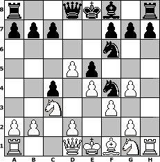 game notation in PGN-format [Event "STHLM"] [Site "www.myChess.de"] [Date "2010.03.25"] [Round "2"] [White "Schmalte"] [Black "Haneken"] [ECO "D20"] [WhitemyELO "1393"] [BlackmyELO "1443"] [Result "0-1"] [TimeControl "10/1728000"] [WhiteDays "00"] [BlackDays "10"] [MyChessNo "64312"] 1. d4 d5 2. c4 dxc4 3. e4 Nf6 4. Nc3 Nc6 5. d5 Ne5 6. Bf4 Bg4 7. f3 Ng6 8. h3 Nxf4 9. hxg4 e5 0-1 position notation in FEN-format r2qkb1r/ppp2ppp/5n2/3Pp3/2p1PnP1/2N2P2/PP1P2P1/R2QKBNR - KQkq - 0 10 Captured white pieces: Captured black pieces: Click on a captured piece in order to display the desired move!