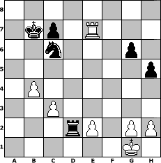 game notation in PGN-format [Event "2.No-Engine-Schachturnier"] [Site "www.myChess.de"] [Date "2013.08.15"] [Round "1"] [White "Knight"] [Black "paul"] [ECO "C20"] [WhitemyELO "1341"] [BlackmyELO "1323"] [Result "0-1"] [TimeControl "10/1728000"] [WhiteDays "20"] [BlackDays "20"] [MyChessNo "89779"] 1. e4 e5 2. Qh5 Nc6 3. Bc4 Qf6 4. Nf3 g6 5. Qh4 d6 6. Nc3 Qxh4 7. Nxh4 Be6 8. Bxe6 fxe6 9. Nf3 Be7 10. d3 O-O-O 11. Be3 Nf6 12. O-O d5 13. Ng5 Rhf8 14. Nxe6 Rfe8 15. Nxd8 Rxd8 16. exd5 Nxd5 17. Nxd5 Rxd5 18. f4 exf4 19. Rxf4 Nd8 20. d4 Bg5 21. Rf3 Bxe3+ 22. Rxe3 Rxd4 23. c3 Rd2 24. b4 b5 25. Re7 h5 26. a4 a6 27. axb5 axb5 28. Ra8+ Kb7 29. Ra5 Nc6 30. Rxb5+ Ka6 31. Rb7 Kxb7 0-1 position notation in FEN-format 8/1kp1R3/2n3p1/7p/1P6/2P5/3rP1PP/6K1 - - - 0 32 Captured white pieces: Captured black pieces: Click on a captured piece in order to display the desired move!