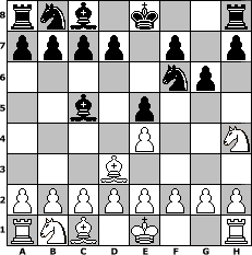 game notation in PGN-format [Event "unter uns Nr. 16"] [Site "www.myChess.de"] [Date "2014.01.28"] [Round "1"] [White "Mattheus"] [Black "Achimkogge"] [ECO "C20"] [WhitemyELO "1298"] [BlackmyELO "1428"] [Result "0-1"] [TimeControl "10/864000"] [WhiteDays "00"] [BlackDays "07"] [MyChessNo "92590"] 1. e4 e5 2. Qh5 Qf6 3. Nf3 g6 4. Qh4 Qxh4 5. Nxh4 Nf6 6. Bd3 Bc5 0-1 position notation in FEN-format rnb1k2r/pppp1p1p/5np1/2b1p3/4P2N/3B4/PPPPPPPP/RNB1K2R - KQkq - 3 7 Captured white pieces: ![]() ![]() ![]() ![]() ![]() ![]() ![]() ![]() ![]() ![]() ![]() ![]() ![]() ![]() ![]() Captured black pieces: ![]() ![]() ![]() ![]() ![]() ![]() ![]() ![]() ![]() ![]() ![]() ![]() ![]() ![]() ![]() Click on a captured piece in order to display the desired move!