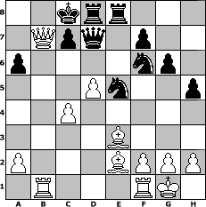 game notation in PGN-format [Event "2013 zum Ersten"] [Site "www.myChess.de"] [Date "2013.01.01"] [Round "1"] [White "Grubengeist"] [Black "Schefsche"] [ECO "C44"] [WhitemyELO "1958"] [BlackmyELO "1435"] [Result "1-0"] [TimeControl "10/2592000"] [WhiteDays "48"] [BlackDays "44"] [MyChessNo "85785"] 1. e4 e5 2. Nf3 Nc6 3. d4 exd4 4. c3 d5 5. exd5 Qxd5 6. cxd4 Bg4 7. Be2 O-O-O 8. Nc3 Bb4 9. O-O Bxc3 10. bxc3 Nf6 11. Be3 Rhe8 12. c4 Qd7 13. d5 Bxf3 14. Bxf3 Ne5 15. Be2 a6 16. Rb1 h5 17. Qb3 g6 18. Qxb7# 1-0 position notation in FEN-format 2krr3/1Qpq1p2/p4np1/3Pn2p/2P5/4B3/P3BPPP/1R3RK1 - - - 0 18 Captured white pieces: Captured black pieces: Click on a captured piece in order to display the desired move!