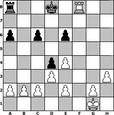 game notation in PGN-format [Event "Schach dem Nicolaus VI"] [Site "www.myChess.de"] [Date "2017.11.22"] [Round "1"] [White "JohnWayne"] [Black "beowulf"] [ECO "B23"] [WhitemyELO "1522"] [BlackmyELO "1359"] [Result "1-0"] [TimeControl "10/2592000"] [WhiteDays "82"] [BlackDays "86"] [MyChessNo "110446"] 1. e4 c5 2. Nc3 Nc6 3. f4 d6 4. Nf3 Bg4 5. Bb5 a6 6. Bxc6+ bxc6 7. d3 d5 8. O-O d4 9. Na4 e6 10. h3 Bxf3 11. Qxf3 g6 12. f5 Bg7 13. fxg6 f6 14. Qg4 Qe7 15. gxh7 Nh6 16. Bxh6 Bxh6 17. Qg8+ Rxg8 18. hxg8=Q+ Bf8 19. Rxf6 Qxf6 20. Rf1 Qe7 21. Nxc5 Qxc5 22. Qf7+ Kd8 23. Qxf8+ Qxf8 24. Rxf8+ 1-0 position notation in FEN-format r2k1R2/8/p1p1p3/8/3pP3/3P3P/PPP1P1P1/6K1 - - - 0 24 Captured white pieces: Captured black pieces: Click on a captured piece in order to display the desired move!