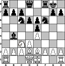 game notation in PGN-format [Event "Winterm"] [Site "www.myChess.de"] [Date "2006.11.29"] [Round "1"] [White "FreshPrinc2"] [Black "Knight"] [ECO "C20"] [WhitemyELO "1671"] [BlackmyELO "1317"] [Result "0-1"] [TimeControl "10/864000"] [WhiteDays "00"] [BlackDays "10"] [MyChessNo "30529"] 1. e4 e5 2. d3 Nf6 3. Nf3 Nc6 4. Nc3 Bb4 5. Bd2 d6 6. Be2 Be6 7. Ng5 O-O 8. Nxe6 fxe6 0-1 position notation in FEN-format r2q1rk1/ppp3pp/2nppn2/4p3/1b2P3/2NP4/PPPBBPPP/R2QK2R - KQ - 0 9 Captured white pieces: Captured black pieces: Click on a captured piece in order to display the desired move!
