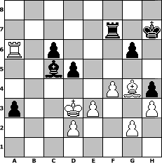 game notation in PGN-format [Event "Die Weinlese"] [Site "www.myChess.de"] [Date "2016.09.01"] [Round "1"] [White "espero"] [Black "muetoe"] [ECO "D00"] [WhitemyELO "1886"] [BlackmyELO "1965"] [Result "0-1"] [TimeControl "10/1728000"] [WhiteDays "66"] [BlackDays "70"] [MyChessNo "104668"] 1. d4 d5 2. Bf4 Bf5 3. e3 c6 4. c4 Bxb1 5. Qxb1 e6 6. c5 a5 7. a3 a4 8. Bd3 h5 9. Nf3 Qa5+ 10. Ke2 Nd7 11. Qc2 b5 12. Rhb1 Be7 13. b4 axb3 14. Qxb3 Bd8 15. a4 bxa4 16. Qb7 Ne7 17. Bd6 Ra7 18. Qb4 h4 19. h3 Nc8 20. Qxa5 Rxa5 21. Bh2 Bf6 22. Ra3 e5 23. dxe5 Be7 24. e6 fxe6 25. Bg6+ Kf8 26. Nd4 Rh6 27. Nxe6+ Kg8 28. Bf5 Nxc5 29. Nxc5 Bxc5 30. Bc7 Ra8 31. Rc3 Bf8 32. Bd7 Ra7 33. Bxc8 Rxc7 34. Rb8 a3 35. Ra8 Rf6 36. Bg4 Kh7 37. Rb3 g6 38. Rbb8 Kh6 39. Kd3 Bd6 40. Rh8+ Rh7 41. Rxh7+ Kxh7 42. f4 Rf7 43. Ra6 Bc5 0-1 position notation in FEN-format 8/5r1k/R1p3p1/2bp4/5PBp/p2KP2P/3P2P1/8 - - - 3 44 Captured white pieces: Captured black pieces: Click on a captured piece in order to display the desired move!
