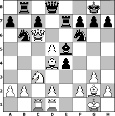 game notation in PGN-format [Event "MYCHESS.DE POTENTIAL FINAL TOURNAMENT"] [Site "www.myChess.de"] [Date "2020.10.03"] [Round "1"] [White "Robert"] [Black "muellerh"] [ECO "D06"] [WhitemyELO "1688"] [BlackmyELO "1532"] [Result "1-0"] [TimeControl "10/3456000"] [WhiteDays "04"] [BlackDays "00"] [MyChessNo "119431"] 1. d4 d5 2. c4 Nf6 3. g3 e6 4. Bg2 Bd7 5. Nf3 Be7 6. cxd5 exd5 7. Nc3 O-O 8. Qb3 Bc6 9. Ne5 Nbd7 10. Nxc6 bxc6 11. O-O Rb8 12. Qa4 Re8 13. e4 Nb6 14. Qxc6 dxe4 15. Be3 Bd6 16. Rac1 Re6 17. d5 Re7 18. Bd4 Be5 19. Rfd1 1-0 position notation in FEN-format 1r1q2k1/p1p1rppp/1nQ2n2/3Pb3/3Bp3/2N3P1/PP1P1PBP/2RR2K1 - - - 4 19 Captured white pieces: Captured black pieces: Click on a captured piece in order to display the desired move!