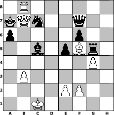 game notation in PGN-format [Event "Thera"] [Site "www.myChess.de"] [Date "2025.07.03"] [Round "1"] [White "Hobbykegler"] [Black "borsti"] [ECO "C41"] [WhitemyELO "1036"] [BlackmyELO "1154"] [Result "1-0"] [TimeControl "10/2592000"] [WhiteDays "091"] [BlackDays "137"] [MyChessNo "133477"] 1. e4 e5 2. Nf3 d6 3. Nc3 Bg4 4. h3 Bxf3 5. Qxf3 a6 6. d3 h6 7. g4 g5 8. Rg1 Ne7 9. Nd5 Nxd5 10. exd5 Nd7 11. Be3 Qf6 12. Qe4 O-O-O 13. c4 Qg7 14. O-O-O Nf6 15. Qf5+ Kb8 16. b3 Be7 17. a4 Qh7 18. Qf3 h5 19. gxh5 Nxh5 20. Qg4 Rhg8 21. Bg2 f6 22. Qe6 Rgf8 23. Be4 Qf7 24. Qf5 Ng7 25. Qf3 Rh8 26. d4 Rh4 27. Rg4 Rdh8 28. Rh1 R8h5 29. Bxg5 Rxg4 30. hxg4 Rxg5 31. Rh8+ Ka7 32. Rc8 Ne8 33. a5 b6 34. axb6+ Kb7 35. Bf5 Bf8 36. c5 dxc5 37. dxc5 Bxc5 38. d6+ Kxb6 39. dxc7 Nxc7 40. Rb8+ Ka7 41. Qb7# 1-0 position notation in FEN-format 1R6/kQn2q2/p4p2/2b1pBr1/6P1/1P6/4PP2/2K5 - - - 3 41 Captured white pieces: Captured black pieces: Click on a captured piece in order to display the desired move!