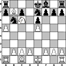 game notation in PGN-format [Event "Und wieder Aljechin...."] [Site "www.myChess.de"] [Date "2011.06.17"] [Round "1"] [White "woern63"] [Black "Knight"] [ECO "B02"] [WhitemyELO "1885"] [BlackmyELO "1086"] [Result "1-0"] [TimeControl "10/2592000"] [WhiteDays "58"] [BlackDays "60"] [MyChessNo "74621"] 1. e4 Nf6 2. Nc3 d5 3. e5 d4 4. Nce2 Ng8 5. Nf3 Bg4 6. Nexd4 Bxf3 7. Qxf3 e6 8. Qxb7 Nd7 9. Nc6 Qc8 10. Ba6 Nb6 11. a4 Ne7 12. a5 Qxb7 13. Bxb7 1-0 position notation in FEN-format r3kb1r/pBp1nppp/1nN1p3/P3P3/8/8/1PPP1PPP/R1B1K2R - KQkq - 0 13 Captured white pieces: Captured black pieces: Click on a captured piece in order to display the desired move!