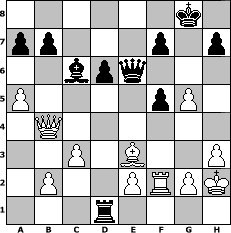game notation in PGN-format [Event "Mal verliert man, mal gewinnen die anderen"] [Site "www.myChess.de"] [Date "2010.04.17"] [Round "1"] [White "Erich"] [Black "Schachfedi"] [ECO "C42"] [WhitemyELO "1810"] [BlackmyELO "1801"] [Result "1/2-1/2"] [TimeControl "10/864000"] [WhiteDays "30"] [BlackDays "20"] [MyChessNo "64921"] 1. e4 e5 2. Nf3 Nf6 3. Nc3 Nc6 4. Bb5 Bc5 5. O-O O-O 6. Nxe5 Nxe5 7. d4 Bd6 8. f4 Nc6 9. e5 Be7 10. exf6 Bxf6 11. d5 Nd4 12. Bd3 d6 13. Ne4 Nf5 14. c3 Bd7 15. a4 Re8 16. a5 c6 17. Qb3 cxd5 18. Qxd5 Rb8 19. Ng5 Bxg5 20. fxg5 g6 21. Bf4 Bc6 22. Qc4 Qd7 23. Rf2 Rbc8 24. Qb4 Re6 25. Bxf5 gxf5 26. h3 Rce8 27. Rd1 Re1+ 28. Rxe1 Rxe1+ 29. Kh2 Rd1 30. Be3 Qe6 1/2-1/2 position notation in FEN-format 6k1/pp3p1p/2bpq3/P4pP1/1Q6/2P1B2P/1P2PRPK/3r4 - - - 4 31 Captured white pieces: Captured black pieces: Click on a captured piece in order to display the desired move!
