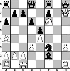 game notation in PGN-format [Event "Dabei ist alles 2"] [Site "www.myChess.de"] [Date "2008.04.04"] [Round "1"] [White "thw"] [Black "Steppenwolf"] [ECO "C65"] [WhitemyELO "1519"] [BlackmyELO "1435"] [Result "1-0"] [TimeControl "10/864000"] [WhiteDays "10"] [BlackDays "10"] [MyChessNo "44058"] 1. e4 e5 2. Nf3 Nc6 3. Bb5 Nf6 4. d3 Bc5 5. Nc3 d6 6. Bg5 Bg4 7. Nd5 O-O 8. h3 Bh5 9. Bxf6 gxf6 10. Qd2 Bxf3 11. gxf3 a6 12. Ba4 Nd4 13. Qh6 Nxf3+ 14. Ke2 Nd4+ 15. Kd2 Nf3+ 16. Kc1 Bxf2 17. Nxf6+ Kh8 18. Qxh7# 1-0 position notation in FEN-format r2q1r1k/1pp2p1Q/p2p1N2/4p3/B3P3/3P1n1P/PPP2b2/R1K4R - - - 0 18 Captured white pieces: Captured black pieces: Click on a captured piece in order to display the desired move!