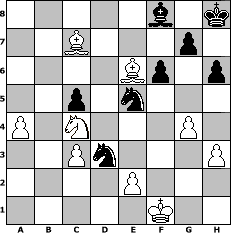 game notation in PGN-format [Event "Aljechin zum z\'Nacht...."] [Site "www.myChess.de"] [Date "2006.09.09"] [Round "2"] [White "bjeu"] [Black "wasserandy"] [ECO "B02"] [WhitemyELO "2163"] [BlackmyELO "1860"] [Result "1-0"] [TimeControl "10/864000"] [WhiteDays "10"] [BlackDays "03"] [MyChessNo "28309"] 1. e4 Nf6 2. e5 Nd5 3. Bc4 Nb6 4. Bb3 c5 5. d3 Nc6 6. Nf3 d5 7. exd6 exd6 8. O-O Be7 9. a4 a5 10. Na3 O-O 11. Bf4 Bg4 12. Nb5 Qd7 13. h3 Bh5 14. Re1 Rfe8 15. Bh2 Bf8 16. g4 Rxe1+ 17. Nxe1 Bg6 18. f4 h6 19. Qd2 Re8 20. Nf3 Kh8 21. f5 Bh7 22. Re1 Rxe1+ 23. Qxe1 Bg8 24. Qe3 d5 25. Bc7 Nc8 26. c3 f6 27. Nh4 Bf7 28. Ng6+ Bxg6 29. fxg6 d4 30. Qe6 Qxe6 31. Bxe6 N8e7 32. Nd6 Nxg6 33. Nxb7 dxc3 34. bxc3 Nce5 35. Kf1 Nxd3 36. Nxa5 Nge5 37. Nc4 1-0 position notation in FEN-format 5b1k/2B3p1/4Bp1p/2p1n3/P1N3P1/2Pn3P/4P3/5K2 - - - 2 37 Captured white pieces: ![]() ![]() ![]() ![]() ![]() ![]() ![]() ![]() ![]() ![]() ![]() ![]() ![]() ![]() ![]() Captured black pieces: ![]() ![]() ![]() ![]() ![]() ![]() ![]() ![]() ![]() ![]() ![]() ![]() ![]() ![]() ![]() Click on a captured piece in order to display the desired move!