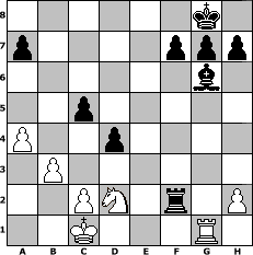 game notation in PGN-format [Event "Italian Open"] [Site "www.myChess.de"] [Date "2007.06.26"] [Round "1"] [White "Knight"] [Black "MartinSilies"] [ECO "A45"] [WhitemyELO "1258"] [BlackmyELO "1426"] [Result "0-1"] [TimeControl "10/864000"] [WhiteDays "13"] [BlackDays "15"] [MyChessNo "36013"] 1. d4 Nf6 2. g4 Nxg4 3. e4 e5 4. Qxg4 d5 5. Qe2 exd4 6. exd5+ Qe7 7. Qxe7+ Bxe7 8. Bg2 c6 9. dxc6 Nxc6 10. Bf4 O-O 11. Nd2 Bf5 12. O-O-O Rad8 13. Bxc6 bxc6 14. Nc4 c5 15. Nf3 Be4 16. Ncd2 Bc6 17. Rde1 Bf6 18. Nc4 Bxf3 19. Rhg1 Rfe8 20. Rxe8+ Rxe8 21. Nd6 Re6 22. b3 Be5 23. Bxe5 Rxe5 24. Nc4 Re2 25. Rf1 Bg2 26. Rg1 Be4 27. Nd2 Bg6 28. a4 Rxf2 0-1 position notation in FEN-format 6k1/p4ppp/6b1/2p5/P2p4/1P6/2PN1r1P/2K3R1 - - - 0 29 Captured white pieces: Captured black pieces: Click on a captured piece in order to display the desired move!