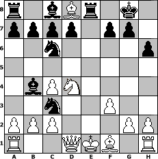 game notation in PGN-format [Event "1.Chess in Friendship"] [Site "www.myChess.de"] [Date "2004.08.10"] [Round "2"] [White "Schili"] [Black "Tarot"] [ECO "A28"] [WhitemyELO "1500"] [BlackmyELO "1829"] [Result "0-1"] [TimeControl "10/2592000"] [WhiteDays "53"] [BlackDays "59"] [MyChessNo "6122"] 1. c4 e5 2. Nc3 Nc6 3. Nf3 Nf6 4. d4 exd4 5. Nxd4 Bb4 6. Bg5 O-O 7. e4 h6 8. Bh4 Re8 9. f3 Nxe4 10. Bxd8 Nxc3+ 0-1 position notation in FEN-format r1bBr1k1/pppp1pp1/2n4p/8/1bPN4/2n2P2/PPP3PP/R2QKB1R - KQ - 0 11 Captured white pieces: Captured black pieces: Click on a captured piece in order to display the desired move!