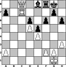 game notation in PGN-format [Event "Vierspringerspiel"] [Site "www.myChess.de"] [Date "2008.10.27"] [Round "1"] [White "Schmalte"] [Black "OwainGwynedd"] [ECO "C49"] [WhitemyELO "1468"] [BlackmyELO "1481"] [Result "1-0"] [TimeControl "10/2592000"] [WhiteDays "74"] [BlackDays "69"] [MyChessNo "49183"] 1. e4 e5 2. Nf3 Nc6 3. Nc3 Nf6 4. Bb5 Bb4 5. O-O O-O 6. d3 d6 7. Bxc6 Bxc3 8. Bxb7 Bxb7 9. bxc3 h6 10. Ba3 Bc8 11. h3 Nh5 12. d4 f6 13. Nd2 Nf4 14. d5 Qe8 15. Qf3 Qa4 16. Bc1 Qxc2 17. Nb3 Nd3 18. Rd1 Ba6 19. Rd2 Qxc3 20. Bb2 Qxd2 21. Nxd2 Nxb2 22. Qa3 Nc4 23. Nxc4 Bxc4 24. Qa4 Be2 25. Qd7 Rac8 26. Rb1 Bd3 27. Rb4 Be2 28. Rb7 Bh5 29. Rxc7 Be8 30. Qxc8 1-0 position notation in FEN-format 2Q1brk1/p1R3p1/3p1p1p/3Pp3/4P3/7P/P4PP1/6K1 - - - 0 30 Captured white pieces: Captured black pieces: Click on a captured piece in order to display the desired move!