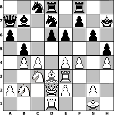 game notation in PGN-format [Event "Die Eisenbahner sind wieder da!!"] [Site "www.myChess.de"] [Date "2016.09.09"] [Round "1"] [White "Erich"] [Black "larlinde"] [Variant "Fischerrandom"] [SetUp "1"] [FEN "bnnrqbkr/pppppppp/8/8/8/8/PPPPPPPP/BNNRQBKR w KQkq - 0 1"] [WhitemyELO "2117"] [BlackmyELO "2146"] [Result "1/2-1/2"] [TimeControl "10/1728000"] [WhiteDays "60"] [BlackDays "21"] [MyChessNo "104844"] 1. e4 b6 2. Nc3 h5 3. h4 e6 4. b3 Bb7 5. Bb2 c5 6. d4 cxd4 7. Rxd4 g6 8. Rd1 Bg7 9. Rh3 Qe7 10. Nd3 d6 11. Nb5 Bxb2 12. Nxb2 O-O 13. c4 Nd7 14. Nc3 Qf6 15. Qd2 Nc5 16. Re1 Ne7 17. b4 Nd7 18. Nb5 Nc8 19. f4 Kh7 20. Bd3 a6 21. Nc3 Qd4+ 22. Re3 b5 23. Rd1 Qa7 1/2-1/2 position notation in FEN-format 2nr1r2/qb1n1p1k/p2pp1p1/1p5p/1PP1PP1P/2NBR3/PN1QP1P1/3R2K1 - - - 2 24 Captured white pieces: Captured black pieces: Click on a captured piece in order to display the desired move!