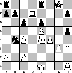game notation in PGN-format [Event "Ohne techn. Hilfsmittel..."] [Site "www.myChess.de"] [Date "2013.02.13"] [Round "1"] [White "haggard"] [Black "sprinterde"] [ECO "A20"] [WhitemyELO "1977"] [BlackmyELO "1686"] [Result "1-0"] [TimeControl "10/864000"] [WhiteDays "30"] [BlackDays "28"] [MyChessNo "86567"] 1. c4 e5 2. g3 c6 3. d4 Bb4+ 4. Bd2 Bxd2+ 5. Qxd2 exd4 6. Qxd4 Qf6 7. Nf3 Qxd4 8. Nxd4 Nf6 9. Bg2 d6 10. Nc3 O-O 11. Rd1 Bg4 12. h3 Be6 13. Nxe6 fxe6 14. Rxd6 Re8 15. e4 Nbd7 16. f4 Nc5 17. b4 Na6 18. e5 Nh5 19. Ne4 Nxb4 20. Bf3 g6 21. Bxh5 gxh5 22. Rd7 1-0 position notation in FEN-format r3r1k1/pp1R3p/2p1p3/4P2p/1nP1NP2/6PP/P1P5/4K2R - K - 1 22 Captured white pieces: Captured black pieces: Click on a captured piece in order to display the desired move!