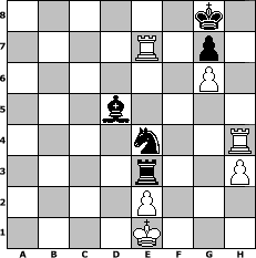game notation in PGN-format [Event "Schachkreis #2"] [Site "www.myChess.de"] [Date "2018.07.05"] [Round "1"] [White "Steffi"] [Black "sprinterde"] [ECO "C01"] [WhitemyELO "1568"] [BlackmyELO "1710"] [Result "0-1"] [TimeControl "10/2592000"] [WhiteDays "30"] [BlackDays "30"] [MyChessNo "112521"] 1. e4 e6 2. d4 Nf6 3. Nc3 Bb4 4. Bd3 c5 5. Nf3 O-O 6. O-O Bxc3 7. bxc3 c4 8. e5 Nd5 9. Bxh7+ Kxh7 10. Ng5+ Kg6 11. Qg4 f5 12. Qg3 Qe7 13. Ne4+ Kh7 14. Bg5 Qa3 15. Bc1 Qa4 16. Ng5+ Kg8 17. Qh4 Re8 18. Qh5 d6 19. Qh7+ Kf8 20. exd6 Nf6 21. Qh8+ Ng8 22. Qh5 Nh6 23. Nh7+ Kg8 24. Qg6 Ng4 25. h3 e5 26. hxg4 Re6 27. Qxf5 Qe8 28. d7 Bxd7 29. Ba3 Ra6 30. Qe4 Rxa3 31. Ng5 Rxc3 32. Qd5+ Kh8 33. Nf7+ Kh7 34. Nxe5 Bc6 35. Qd6 Bd7 36. Rae1 Rxc2 37. Nxc4 Qg6 38. Qb4 Qa6 39. Ne3 Rxa2 40. Qb1+ Kh8 41. Nd5 Qc4 42. Qxb7 Qc6 43. Qb3 Rb2 44. Qh3+ Qh6 45. Nc7 Qxh3 46. gxh3 Bc6 47. Nxa8 Bxa8 48. g5 Bd5 49. g6 Rb6 50. Re8+ Bg8 51. Kh2 Nd7 52. Rg1 Nf6 53. Ra8 Rd6 54. Rg5 Rxd4 55. Rxa7 Rd5 56. Rg1 Rf5 57. Kg2 Bd5+ 58. Kf1 Ne4 59. Rg4 Rxf2+ 60. Ke1 Rf3 61. Rh4+ Kg8 62. Re7 Re3+ 0-1 position notation in FEN-format 6k1/4R1p1/6P1/3b4/4n2R/4r2P/4P3/4K3 - - - 6 63 Captured white pieces: Captured black pieces: Click on a captured piece in order to display the desired move!
