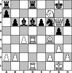 game notation in PGN-format [Event "Wrixum - Open die XIII"] [Site "www.myChess.de"] [Date "2016.09.28"] [Round "1"] [White "alibengali"] [Black "Joschi"] [ECO "B17"] [WhitemyELO "1637"] [BlackmyELO "1573"] [Result "1-0"] [TimeControl "10/2592000"] [WhiteDays "30"] [BlackDays "30"] [MyChessNo "105054"] 1. e4 c6 2. d4 d5 3. Nc3 dxe4 4. Nxe4 Nd7 5. Bc4 Ngf6 6. Ng5 e6 7. Qe2 Nb6 8. Bb3 Be7 9. N1f3 O-O 10. O-O h6 11. Ne4 Nxe4 12. Qxe4 Nd5 13. c4 Nf6 14. Qc2 Qc7 15. g3 Rd8 16. Bf4 Bd6 17. Ne5 c5 18. Rad1 cxd4 19. Rxd4 b6 20. Rfd1 Bb7 21. Ba4 g5 22. Nxf7 Qc6 23. Bxc6 Bxc6 24. Qg6+ 1-0 position notation in FEN-format r2r2k1/p4N2/1pbbpnQp/6p1/2PR1B2/6P1/PP3P1P/3R2K1 - - - 1 24 Captured white pieces: Captured black pieces: Click on a captured piece in order to display the desired move!