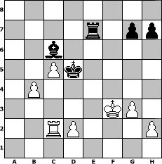 game notation in PGN-format [Event "Ranglistenturnier DWZ 1800 bis 2380 Gr.A"] [Site "www.myChess.de"] [Date "2015.03.09"] [Round "1"] [White "espero"] [Black "bjeu"] [ECO "D00"] [WhitemyELO "1951"] [BlackmyELO "2129"] [Result "0-1"] [TimeControl "10/2592000"] [WhiteDays "29"] [BlackDays "30"] [MyChessNo "98468"] 1. d4 d5 2. Bf4 Nf6 3. e3 c5 4. Nc3 cxd4 5. exd4 a6 6. Nf3 Nc6 7. Ne5 e6 8. Nxc6 bxc6 9. Bd3 c5 10. dxc5 Bxc5 11. O-O O-O 12. Be5 Bb7 13. Na4 Bd6 14. Bxd6 Qxd6 15. c4 Qc6 16. c5 e5 17. Re1 Rae8 18. b4 d4 19. f3 e4 20. fxe4 Nxe4 21. Bxe4 Rxe4 22. Rxe4 Qxe4 23. Qf3 f5 24. Rd1 d3 25. a3 a5 26. Qxe4 fxe4 27. Nc3 e3 28. Rxd3 Ba6 29. Rd1 e2 30. Nxe2 Bxe2 31. Rc1 axb4 32. axb4 Rf4 33. Rb1 Bd3 34. Rd1 Bb5 35. Rb1 Kf7 36. g3 Re4 37. Rb2 Ke6 38. Kf2 Kd5 39. Kf3 Re7 40. Rc2 Bc6 0-1 position notation in FEN-format 8/4r1pp/2b5/2Pk4/1P6/5KP1/2RP3P/8 - - - 9 41 Captured white pieces: Captured black pieces: Click on a captured piece in order to display the desired move!