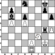 game notation in PGN-format [Event "Fr"] [Site "www.myChess.de"] [Date "2008.02.07"] [Round "2"] [White "bluescreenlover"] [Black "Juliette2103"] [ECO "C24"] [WhitemyELO "1219"] [BlackmyELO "1559"] [Result "0-1"] [TimeControl "10/2592000"] [WhiteDays "97"] [BlackDays "24"] [MyChessNo "42470"] 1. e4 e5 2. Bc4 Nf6 3. d3 Bc5 4. Nf3 Nc6 5. O-O O-O 6. Nc3 d6 7. h3 Be6 8. Bg5 Bxc4 9. dxc4 h6 10. Bxf6 Qxf6 11. Nd5 Qd8 12. a3 a5 13. c3 f5 14. exf5 Rxf5 15. g4 Rf7 16. Qd3 Qf8 17. Kg2 Re8 18. Qe4 Nd8 19. Nxc7 Rxc7 20. Qd5+ Qf7 21. b4 axb4 22. axb4 Qxd5 23. cxd5 Bb6 24. Ra8 Kf7 25. Ra2 e4 26. Nd2 Re5 27. Rc2 Kg8 28. Re1 e3 29. fxe3 Rxe3 30. Nf3 Rcxc3 31. Rxc3 Rxc3 32. h4 Rc4 33. b5 Rxg4+ 0-1 position notation in FEN-format 3n2k1/1p4p1/1b1p3p/1P1P4/6rP/5N2/4P1K1/4R3 - - - 0 34 Captured white pieces: ![]() ![]() ![]() ![]() ![]() ![]() ![]() ![]() ![]() ![]() ![]() ![]() ![]() ![]() ![]() Captured black pieces: ![]() ![]() ![]() ![]() ![]() ![]() ![]() ![]() ![]() ![]() ![]() ![]() ![]() ![]() ![]() Click on a captured piece in order to display the desired move!