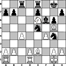 game notation in PGN-format [Event "Gary COME BACK Turnier"] [Site "www.myChess.de"] [Date "2005.03.18"] [Round "1"] [White "chessmike"] [Black "Lanzelot"] [ECO "A48"] [WhitemyELO "1869"] [BlackmyELO "1658"] [Result "1-0"] [TimeControl "10/1728000"] [WhiteDays "20"] [BlackDays "19"] [MyChessNo "11244"] 1. d4 Nf6 2. Nf3 g6 3. c4 Bg7 4. Nc3 O-O 5. e4 d6 6. Be2 Re8 7. O-O Nbd7 8. e5 dxe5 9. dxe5 Ng4 10. e6 Nde5 11. Ng5 Qxd1 12. Rxd1 f6 13. Nb5 fxg5 14. Nxc7 Bxe6 15. Nxe6 Rac8 16. Bxg5 Bf6 17. f4 1-0 position notation in FEN-format 2r1r1k1/pp2p2p/4Nbp1/4n1B1/2P2Pn1/8/PP1PB1PP/R2R2K1 - - - 0 17 Captured white pieces: Captured black pieces: Click on a captured piece in order to display the desired move!