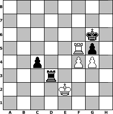game notation in PGN-format [Event "80 Jahre Weltmeister Max Euwe"] [Site "www.myChess.de"] [Date "2015.07.20"] [Round "1"] [White "sprinterde"] [Black "Joschi"] [ECO "A57"] [WhitemyELO "1727"] [BlackmyELO "1567"] [Result "1/2-1/2"] [TimeControl "10/2592000"] [WhiteDays "207"] [BlackDays "210"] [MyChessNo "99755"] 1. d4 Nf6 2. c4 c5 3. d5 b5 4. e3 bxc4 5. Bxc4 d6 6. Nc3 g6 7. Nf3 Bg7 8. O-O O-O 9. h3 Nbd7 10. e4 Nb6 11. Bb5 Bd7 12. Qe2 Bxb5 13. Nxb5 a6 14. Na3 Qc7 15. Bg5 Rfb8 16. Rae1 Nbd7 17. Nc4 Nb6 18. b3 Nxc4 19. bxc4 Rb4 20. e5 Ne8 21. e6 f6 22. Bd2 Rb2 23. Qd3 Rab8 24. Ra1 f5 25. Bc3 Bxc3 26. Qxc3 Nf6 27. Nd2 R2b4 28. f3 Qa7 29. a3 Rb2 30. Rfe1 a5 31. g4 fxg4 32. hxg4 h6 33. Ne4 Nxe4 34. Rxe4 R8b3 35. Qc1 g5 36. Qf1 Rc3 37. Re2 Rxe2 38. Qxe2 Qb8 39. Qe4 Qf8 40. Kg2 Qg7 41. Rb1 Qf8 42. a4 Ra3 43. Rb2 Qf6 44. Rb6 Ra2+ 45. Kh3 Rxa4 46. Rxd6 Ra3 47. Rd8+ Kg7 48. Kg3 Qa1 49. Qe2 Qg1+ 50. Qg2 Qe1+ 51. Qf2 Qe5+ 52. Kh3 Qe4 53. Kg3 Qf4+ 54. Kg2 Rd3 55. Qb2+ Qd4 56. Qxd4+ Rxd4 57. Ra8 Kf6 58. Rxa5 Rxc4 59. Kf2 Ke5 60. Ra7 Kxd5 61. Rxe7 Kd6 62. Rh7 Kxe6 63. Rxh6+ Kf7 64. Rc6 Rc3 65. Ke2 c4 66. Rc5 Kg6 67. Rf5 Rd3 68. f4 1/2-1/2 position notation in FEN-format 8/8/6k1/5Rp1/2p2PP1/3r4/4K3/8 - - - 0 68 Captured white pieces: Captured black pieces: Click on a captured piece in order to display the desired move!