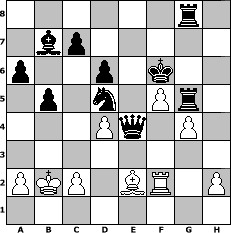 game notation in PGN-format [Event "Aljechin - zum F"] [Site "www.myChess.de"] [Date "2008.10.11"] [Round "1"] [White "BobbyF4"] [Black "muellerh"] [ECO "B02"] [WhitemyELO "1482"] [BlackmyELO "1530"] [Result "0-1"] [TimeControl "10/1728000"] [WhiteDays "73"] [BlackDays "62"] [MyChessNo "48731"] 1. e4 Nf6 2. Bc4 e5 3. Nc3 Bb4 4. Nf3 Nc6 5. d3 O-O 6. O-O Bxc3 7. bxc3 a6 8. Bg5 h6 9. Bh4 g5 10. Nxg5 hxg5 11. Bxg5 d6 12. Qf3 Kg7 13. Qg3 Nh5 14. Qh4 f6 15. Be3 Rh8 16. f4 f5 17. Qf2 Nxf4 18. Bxf4 exf4 19. exf5 Qh4 20. Qxf4 Kf6 21. d4 Rh5 22. g4 Rg5 23. Be2 Ne7 24. Kh1 b5 25. Rf2 Bb7+ 26. Kg1 Rag8 27. Kf1 Qh3+ 28. Ke1 Qxc3+ 29. Kd1 Qxa1+ 30. Kd2 Nd5 31. Qe4 Qc3+ 32. Kc1 Qe3+ 33. Kb2 Qxe4 0-1 position notation in FEN-format 6r1/1bp5/p2p1k2/1p1n1Pr1/3Pq1P1/8/PKP1BR1P/8 - - - 0 34 Captured white pieces: Captured black pieces: Click on a captured piece in order to display the desired move!