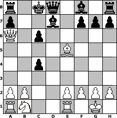 game notation in PGN-format [Event "Schach dem Nikolaus VII"] [Site "www.myChess.de"] [Date "2020.11.23"] [Round "1"] [White "jeremyt"] [Black "Mynona"] [ECO "C45"] [WhitemyELO "2097"] [BlackmyELO "1324"] [Result "1-0"] [TimeControl "10/2592000"] [WhiteDays "30"] [BlackDays "30"] [MyChessNo "119936"] 1. e4 e5 2. Nf3 Nc6 3. d4 exd4 4. Nxd4 Nf6 5. Nxc6 bxc6 6. e5 Nd5 7. c4 Nb6 8. Be3 d5 9. exd6 cxd6 10. Bd3 d5 11. O-O Nxc4 12. Bd4 Qh4 13. Bxc4 dxc4 14. Qa4 Bd7 15. Re1+ Kd8 16. Qa5+ Kc8 17. Be5 Qd8 18. Qa6# 1-0 position notation in FEN-format r1kq1b1r/p2b1ppp/Q1p5/4B3/2p5/8/PP2PPPP/RN2R1K1 - - - 9 18 Captured white pieces: ![]() ![]() ![]() ![]() ![]() ![]() ![]() ![]() ![]() ![]() ![]() ![]() ![]() ![]() ![]() Captured black pieces: ![]() ![]() ![]() ![]() ![]() ![]() ![]() ![]() ![]() ![]() ![]() ![]() ![]() ![]() ![]() Click on a captured piece in order to display the desired move!