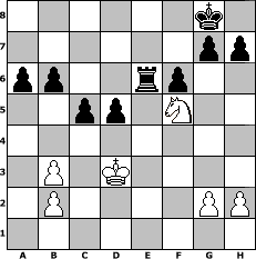 game notation in PGN-format [Event "Gl"] [Site "www.myChess.de"] [Date "2012.06.07"] [Round "1"] [White "beowulf"] [Black "murphy12"] [ECO "A15"] [WhitemyELO "1424"] [BlackmyELO "1678"] [Result "0-1"] [TimeControl "10/2592000"] [WhiteDays "098"] [BlackDays "120"] [MyChessNo "82045"] 1. c4 Nf6 2. d4 e5 3. dxe5 Ng4 4. Bf4 Nc6 5. Nf3 Bc5 6. e3 Qe7 7. Nd4 Ngxe5 8. Nc3 d6 9. Nd5 Qd8 10. Nb5 Bb6 11. Be2 Be6 12. O-O O-O 13. Qc2 Bxd5 14. cxd5 Ne7 15. Rac1 Rc8 16. Bg5 f6 17. Bh4 Nxd5 18. f4 Nxe3 19. Qb3+ N5c4 20. Bxc4+ Nxc4+ 21. Bf2 Bxf2+ 22. Rxf2 d5 23. Nd4 Re8 24. Re2 Rxe2 25. Nxe2 b6 26. Nd4 Qd6 27. Nb5 Qxf4 28. Rf1 Qxf1+ 29. Kxf1 Nd2+ 30. Ke2 Nxb3 31. axb3 a6 32. Nd4 c5 33. Nf5 Re8+ 34. Kd3 Re6 0-1 position notation in FEN-format 6k1/6pp/pp2rp2/2pp1N2/8/1P1K4/1P4PP/8 - - - 4 35 Captured white pieces: ![]() ![]() ![]() ![]() ![]() ![]() ![]() ![]() ![]() ![]() ![]() ![]() ![]() ![]() ![]() Captured black pieces: ![]() ![]() ![]() ![]() ![]() ![]() ![]() ![]() ![]() ![]() ![]() ![]() ![]() ![]() ![]() Click on a captured piece in order to display the desired move!